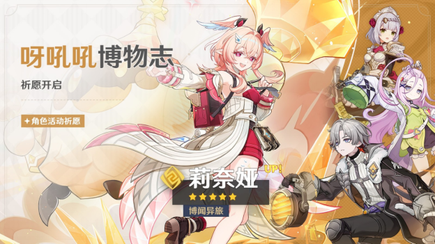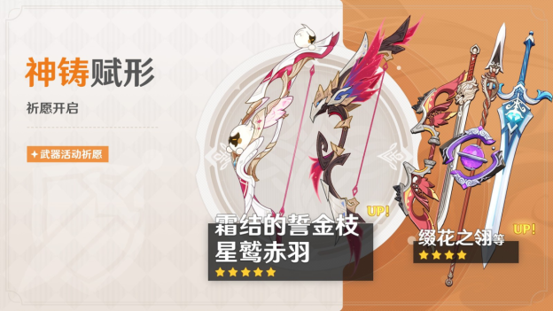 版本更新后至4月29日17:59,「月之六」版本首期角色活动祈愿开启,莉奈娅与恰斯卡迎来概率UP。「神铸赋形」活动祈愿同步开启,全新限定五星弓箭「霜结的誓金枝」与限定五星弓箭「星鹫赤羽」迎来概率UP。