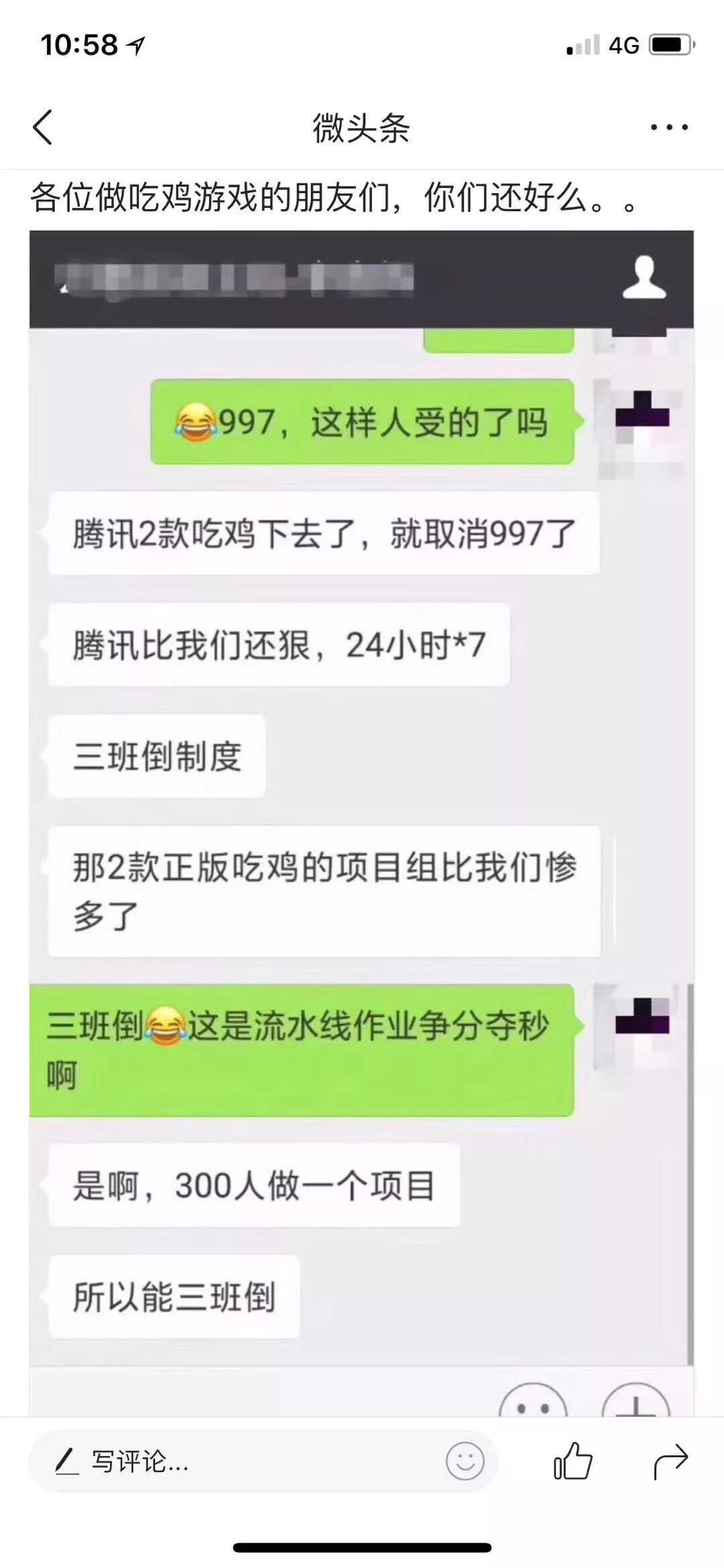 ——自游戏行业某两位高层之间的对话。伴随着腾讯拿下《绝地求生》的代理权后,国内的“吃鸡”游戏的较量愈发激烈。据传闻,腾讯300人做一个项目,三班倒,采用24小时*7的工作制度,加紧时间做出吃鸡游戏。所以玩家的心思你别猜,趁着鸡还热,就日夜不停赶工做“鸡”。