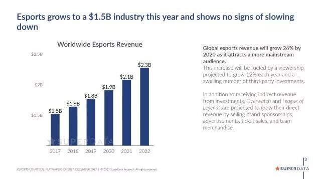 随着电子竞技在全球范围的扩张,亚洲核心电竞市场已不止韩国,电竞产品已成为众多发行商、游戏平台、品牌商的头等大事。Superdata表示,“2017年电竞市场的15亿美元,到2020年全球电竞收入将增长26%,而这一变化主要归功于电竞更加主流化、每年12%的观众增加速度以及第三方投资公司的推动。”