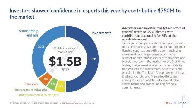 报告指出,电竞的成功很大一部分得归功于大型电竞赛事的巨额奖金池,像Dota2、英雄联盟。但电竞的直接收入还是来自于特许经营费、赞助和商品销售等等,而这些都大有增长趋势。。