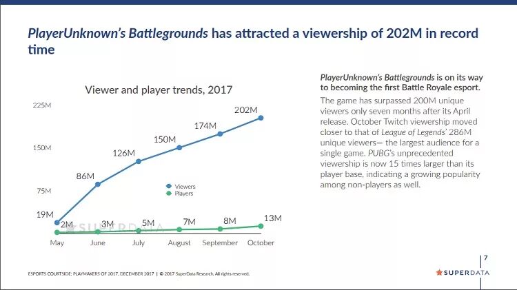 《绝地求生》是今年游戏界的大黑马,SuperData纪录到今年10月份,《绝地求生》玩家数为1300万时,就创造了总数2.02亿人观众的纪录,仅次于第一名《英雄联盟》的2.86亿观众。如果计算吃鸡玩家与观众比例,会达到惊人的1:15,也就意味着这款热门游戏每一名玩家,背后都有15名观众的潜在用户,吃鸡或者说吃鸡题材的游戏,背后仍有巨大潜力尚待挖掘。