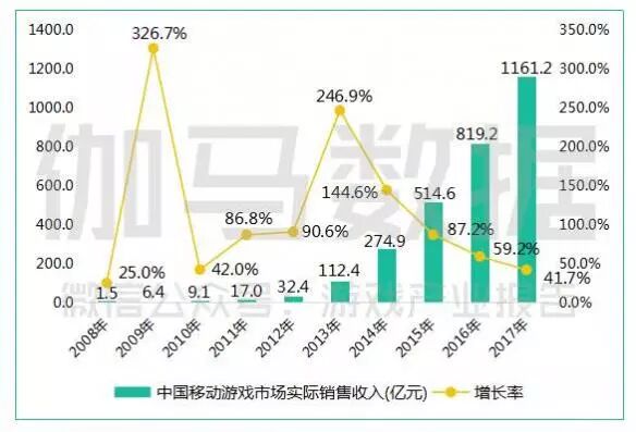 今年移动游戏在收入方面成绩较为抢眼。报告显示,中国移动游戏市场实际销售收入达到1161.2亿元,同比增长41.7%,依旧保持着较高的收入增长。和去年的情况类似,今年中国移动游戏市场收入依然保持着超300亿的增长幅度,能够从一定程度上说明目前中国移动游戏仍然处于高速发展阶段。